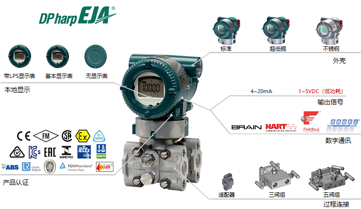 EJA110E高性能差压变送器采用单晶硅谐振式传感器技术,适用于测量液体、气体或蒸汽的流量、液位、密度和压力。EJA110E将测量差压转换成4~20mA DC电流信号输出,可测量、显示或远程监控静压,具有快速响应、远程设定、自诊断等功能。